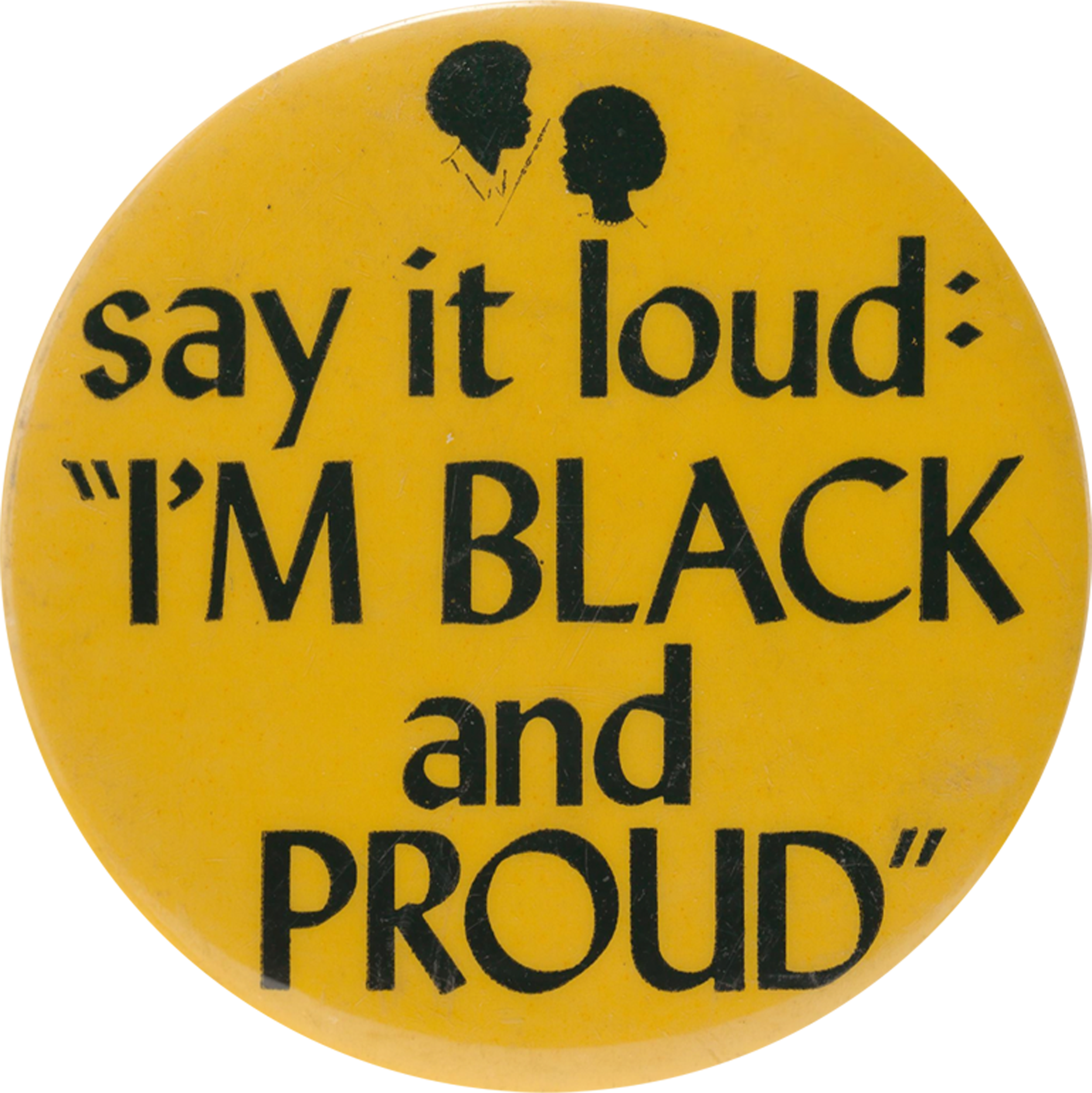 “A pinback button with a yellow background and black text that reads [say it loud: / "I'm Black and Proud"]. Above the text at the top of the button are two silhouettes. The back of the button has a metal pin without a clasp.”